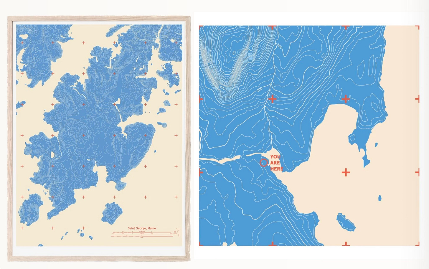 In August I spent a couple weeks in Kennebunk and Spruce Head, Maine. On a drive to Camden, my friend Bob and I stumbled upon some topographical maps made by local resident and shop owner, Keenan Boscoe. I loved the look of his work and the nice part is he’ll custom make a map for anyone’s home by the sea. They’re visually very cool- and a great idea if you need a specific size for your wall. I’ll be ordering one for my Savannah home sometime in the next year- (he quoted me $40/hour and estimated the job would take 6-9 hours) If you have some interest, send him a note…